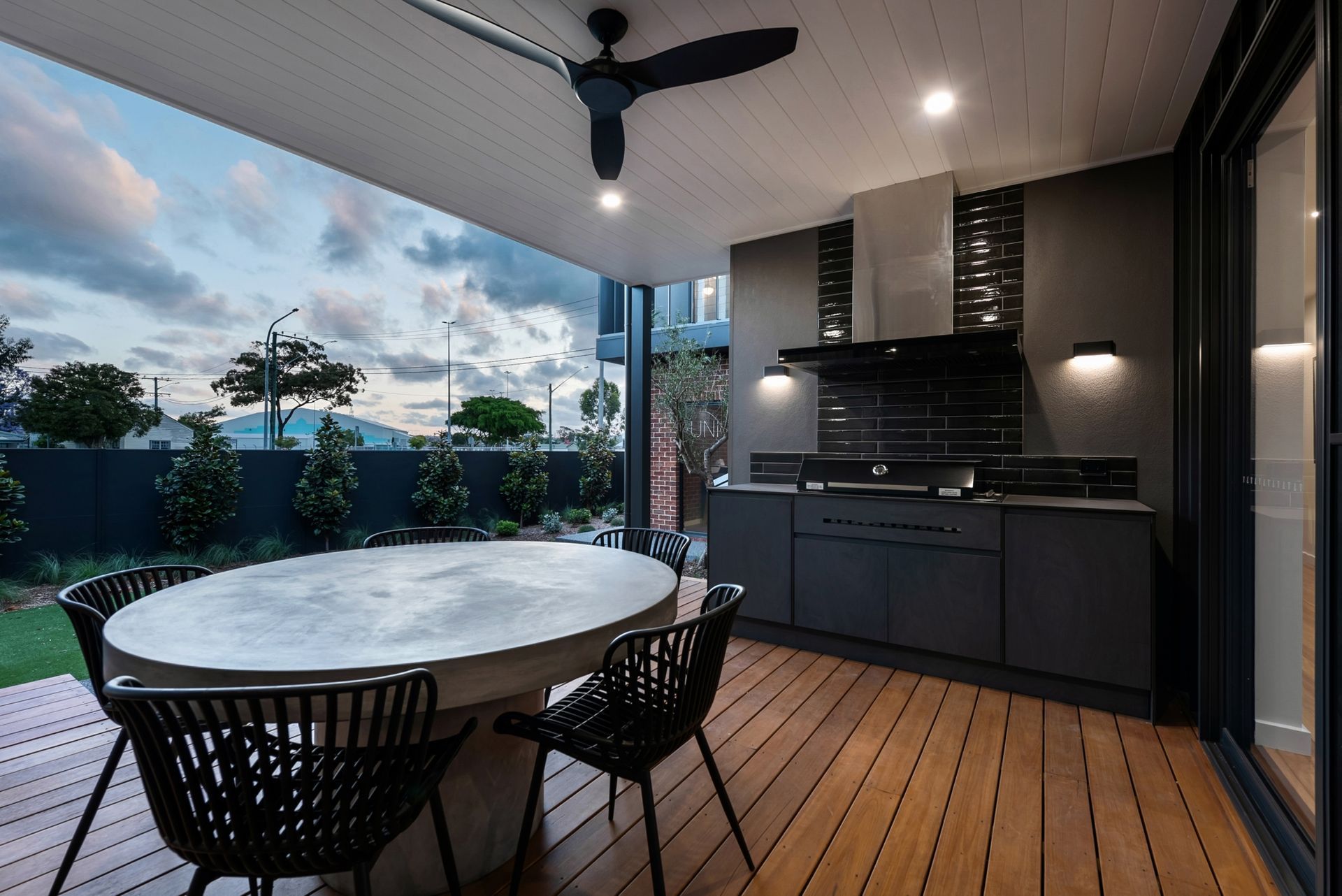 The clever use of elliptical blades not only adds privacy but also serves as a design element that allows northerly sunlight to filter through while mitigating the effects of road noise and the western sun while creating a tranquil oasis within the bustling cityscape.