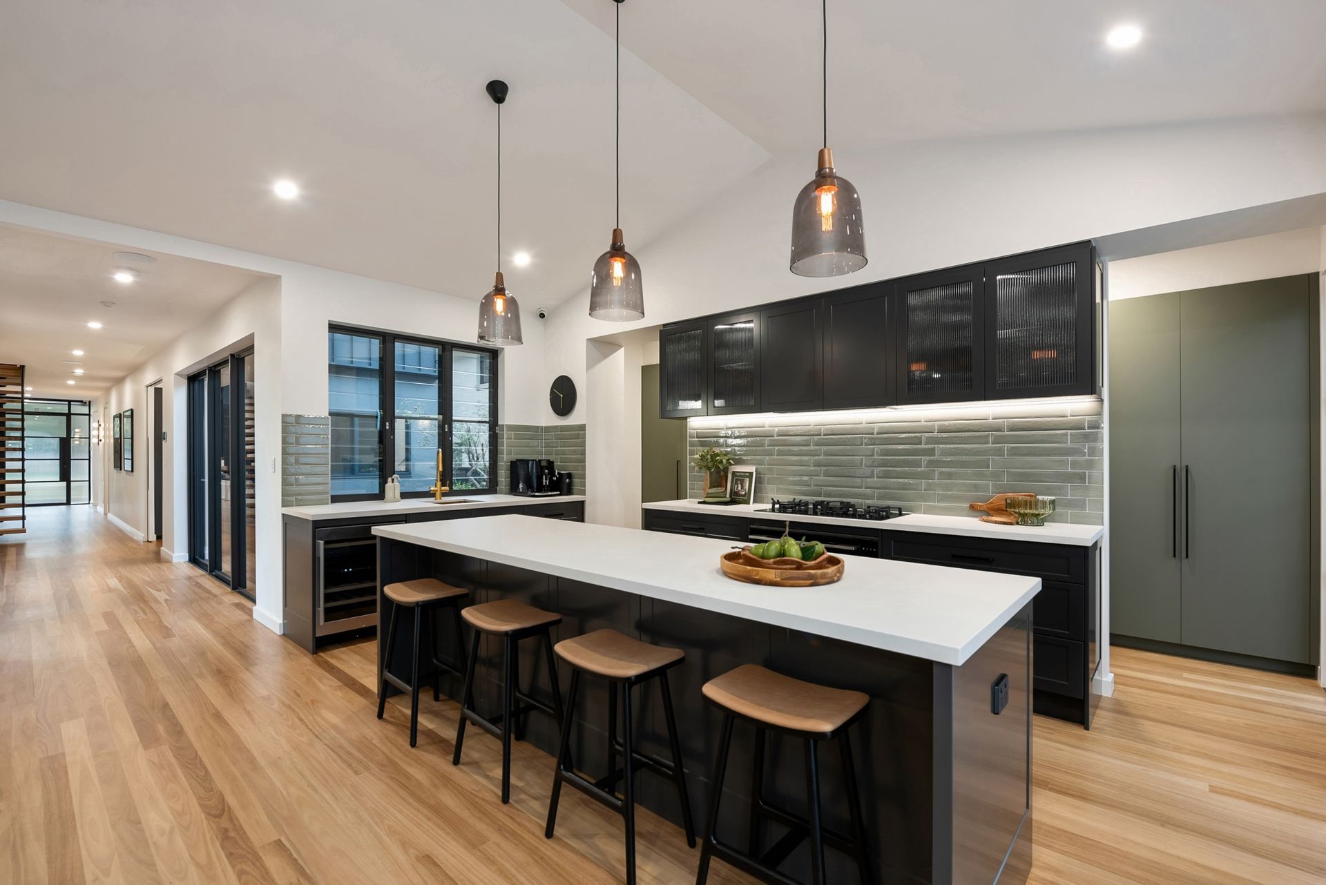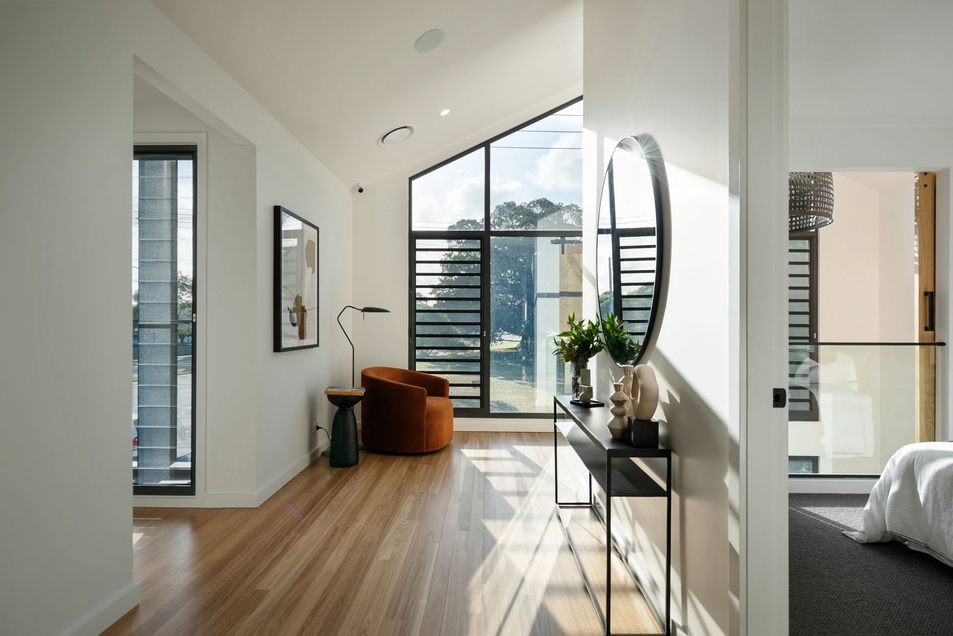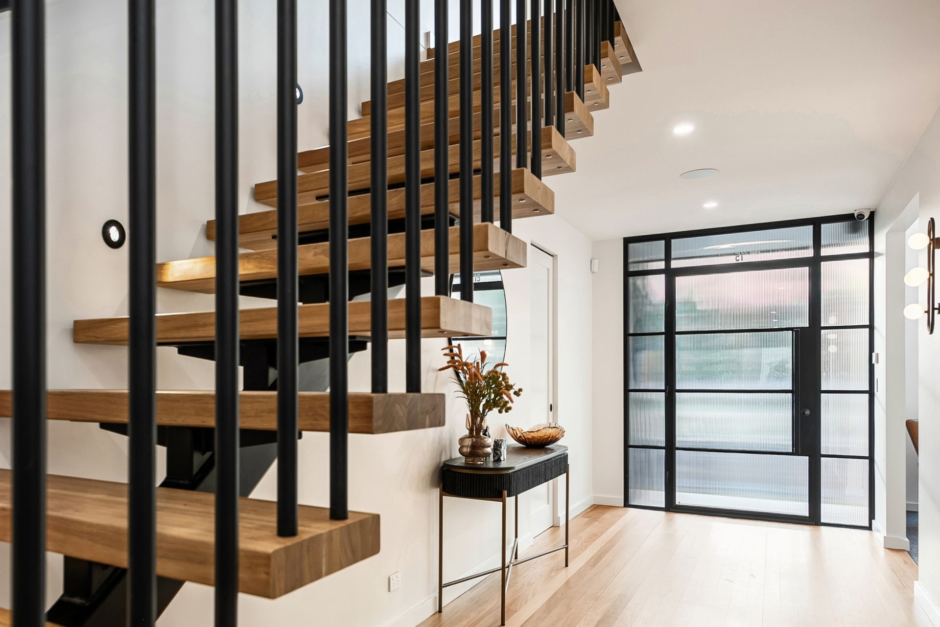 Upon entry, the seamless connectivity with the outdoors is palpable. The front door, a masterpiece of fluted glass and steel, sets the tone for what lies inside—a harmonious blend of functionality and aesthetic appeal. The staircase, featuring black steel bars carries through the industrial theme.